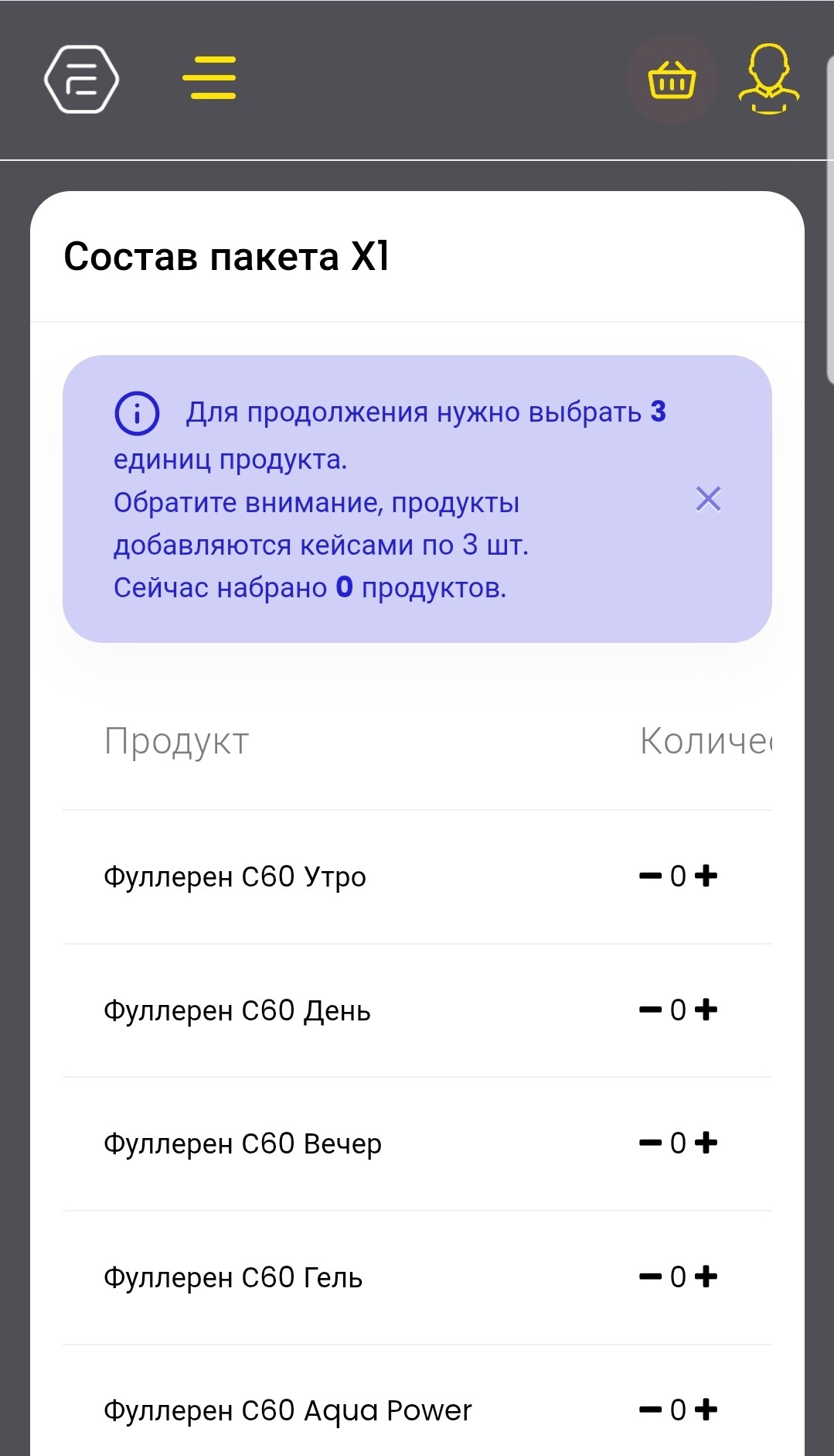Для продолжения нужно выбрать то количество продукта, которое совпадает с выбранным на 1-м шаге пакетом.