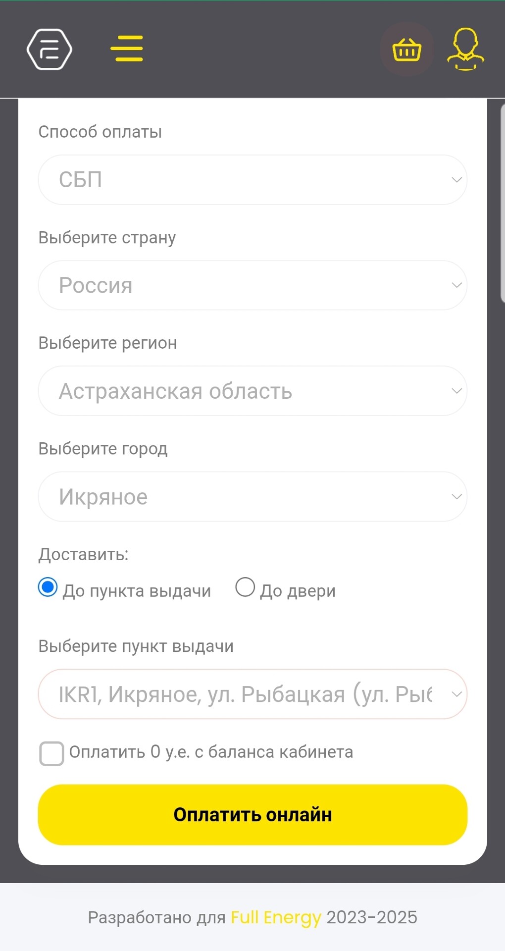 Далее выбираете пункт выдачи СДЭК (пункты автоматически подтянутся в выпадающем списке). Нажмите на кнопку "Оплатить онлайн".