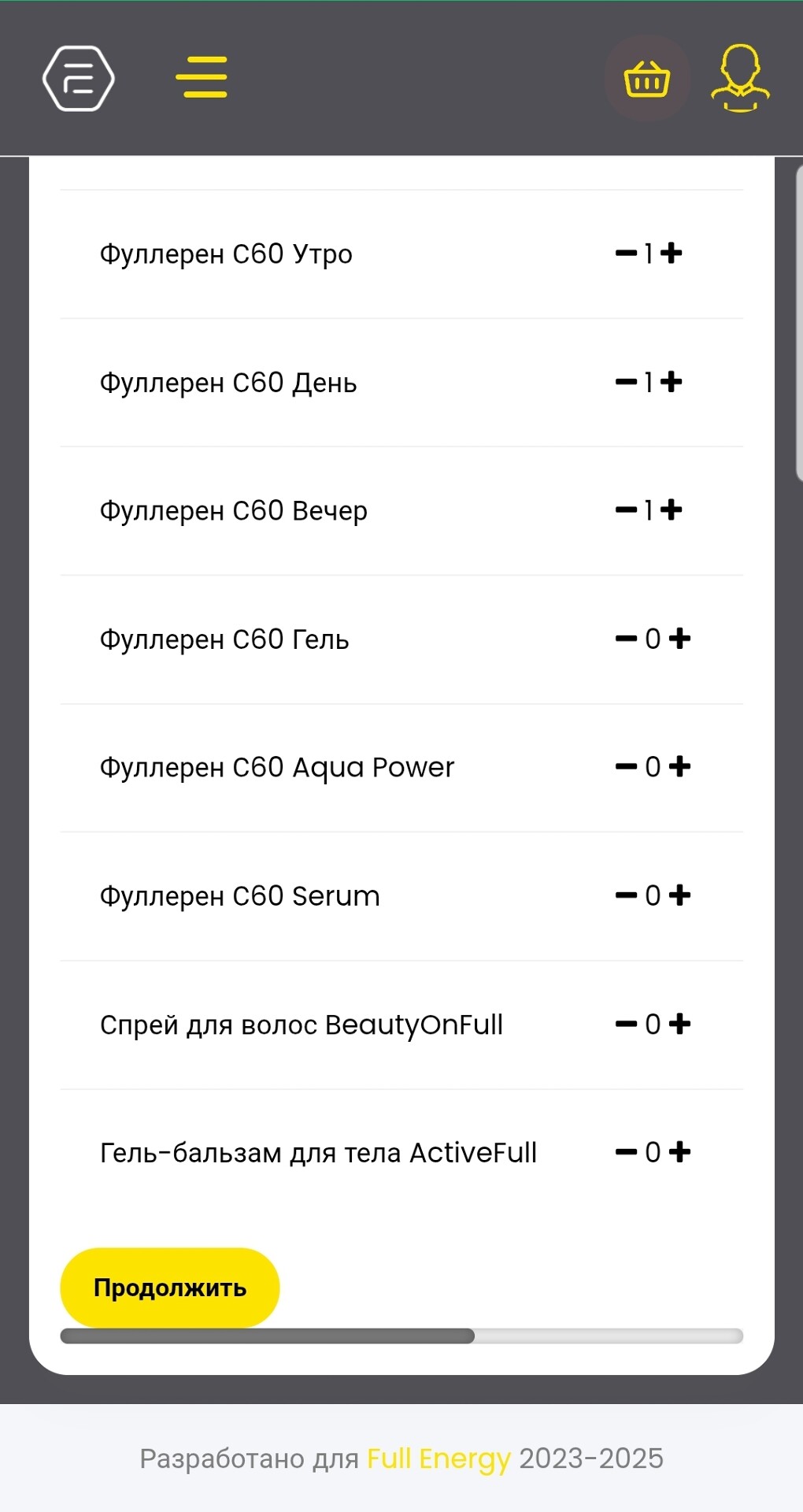 После выбора продуктов нажмите на желтую кнопку "Продолжить" внизу экрана слева. Если вы не видите эту кнопку, просто подвиньте экран влево.